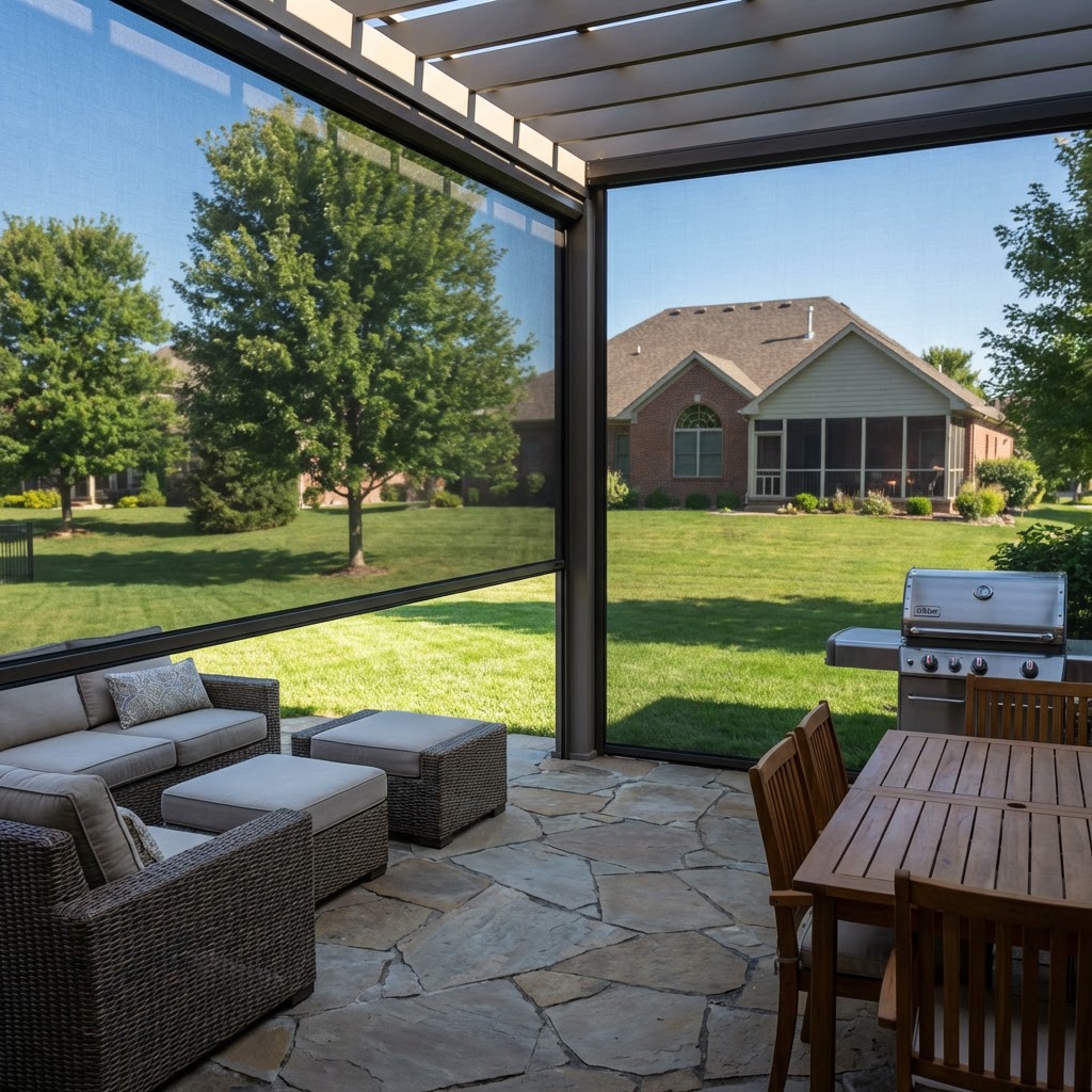 The western sun in St. Charles County can be brutal. It creates glare that makes reading or watching TV outside impossible. It heats up your patio and even your interior rooms. Our exterior solar shades block the heat before it hits your glass. This is a more efficient solution than interior blinds because it stops the heat outside. You keep your view, but you lose the heat and the glare.